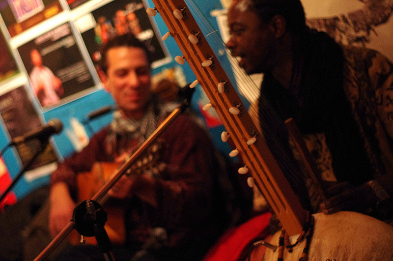 Giulio, detrás de la barra, colgante al cuello y acento italiano, lanza una mirada al que entra, mientras sirve unos botellines a alguien como si no lo tuviese que cobrar nunca. La Grándola es un espacio pequeño, pero cabe un concierto o una obra de teatro. En las paredes están los manifiestos de posiblemente todos los movimientos sociales que hayan pisado el barrio de Lavapiés, o poco falta. Debajo de una reproducción de «El cuarto Estado» de Pellizza da Volpedo, se están afinando guitarra, cajón y lo que damos por bueno como una kora. [su_quote]En pocos minutos, una guitarra flamenca se embarca en un viaje hacia Marruecos, un canto de Senegal se esconde detrás de una percusión andaluza y un ritmo del caribe hace latir las palmas a un chico sentado en una mesita, en primera línea de música. El fantasma bueno de Lavapiés se pasea por el local.[/su_quote]